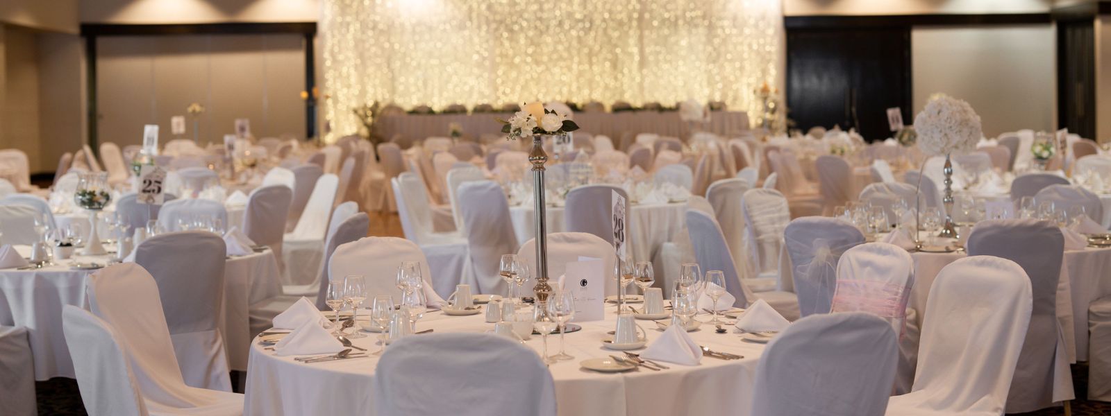 The Finn Suite has the capacity to host a wedding for 100-500 guests, the unique partition means that the room can transform easily and adapt to the numbers needed. We have everything you need for your perfect wedding including a fairy light backdrop to set off your Top Table, a choice of ornate centrepieces, chair covers and linens with a choice of bows to match your theme, cake table with stand and the entrance and suite decorated with flowers and lanterns to create your picture-perfect wedding.